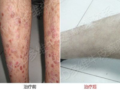 五、红皮病型牛皮癣的皮疹会出现少量渗液,附有湿性鳞屑。或初起为小脓疱,伴有发热等症状者称为脓疱型牛皮癣;合并关节病变者称为关节型牛皮癣。