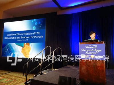 图为:在夏威夷皮肤病研讨会上,中国皮肤病学术领头人、世界自然医学总会皮肤病专家组组长孟中平教授发表关于“中医的优势及在银屑病临床治疗中的运用”的专题演讲